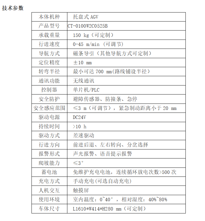 根據(jù)配送產(chǎn)品與現(xiàn)場環(huán)境的不同,我司設計了多款托盤式 AGV,可實現(xiàn)貨物的移載,動作簡單,作業(yè)效率高,安全性好。適合多種貨物形式和笨重物體兩地之間往返搬運,也可作為柔性裝配線、加工線使用可實現(xiàn)AGV與物料車的自動裝載、卸載、搬運、啟停等功能。廣泛應用于電子,倉儲,醫(yī)藥,食品等生產(chǎn)領域。